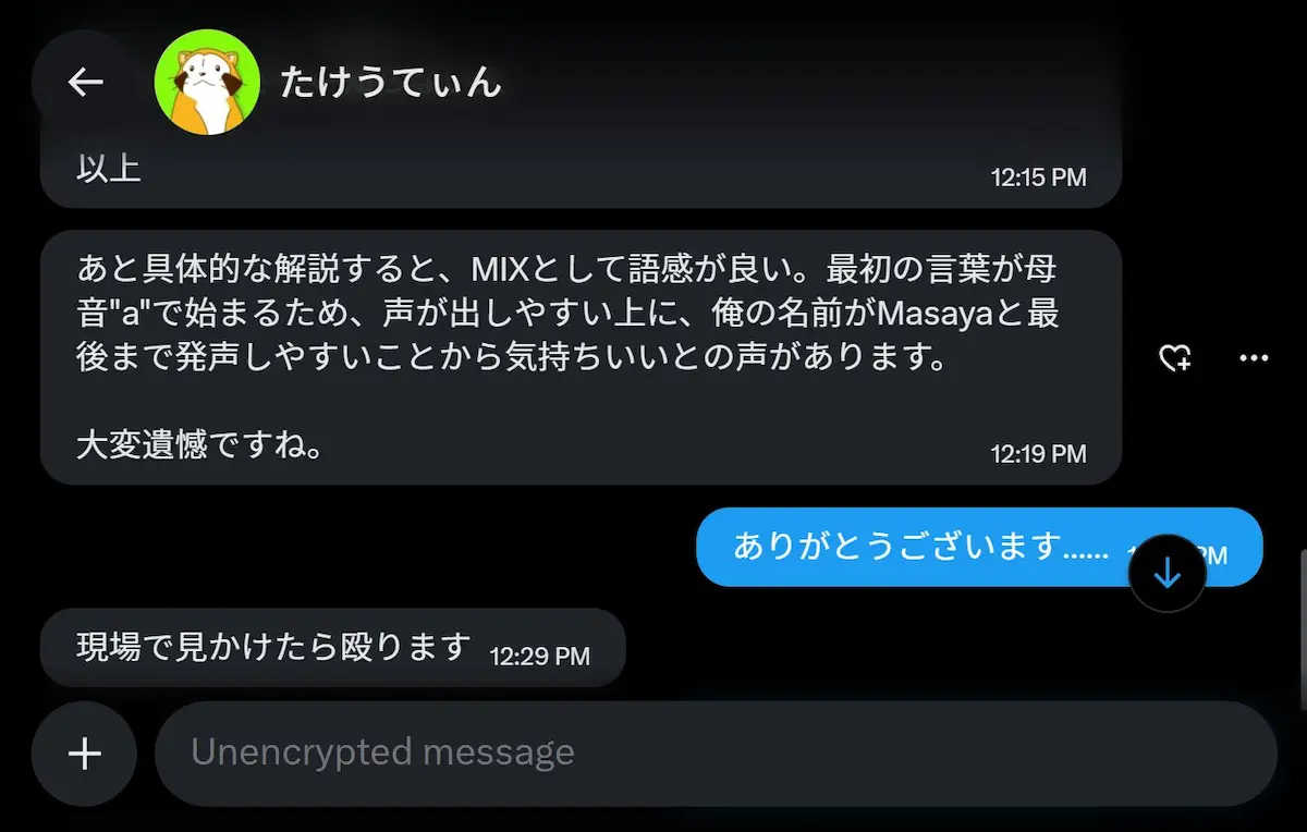 たけうちまさや←知らない人あと具体的な解説すると、MIXとして語感が良い。最初の言葉が母音"a"で始まるため、声が出しやすい上に、俺の名前がMasayaと最後まで発声しやすいことから気持ちいいとの声があります。